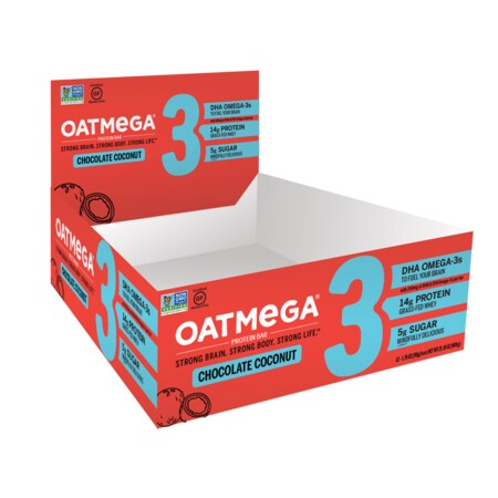 Oatmega Protein Bars, Chocolate Coconut, Healthy Snacks Made with Omega-3 and Grass-Fed Whey Protein, Gluten Free Protein Bars, 1.8oz (12 Count)