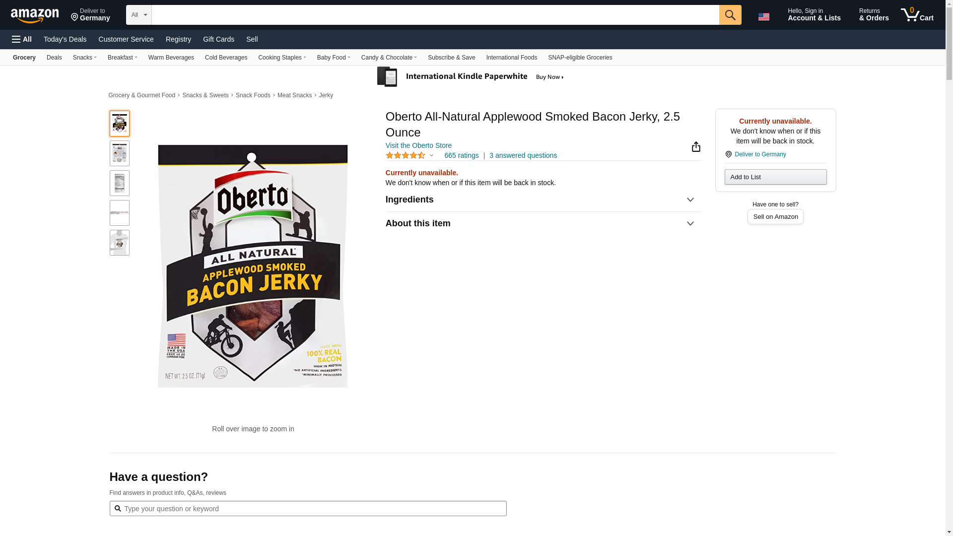 Oberto All-Natural Applewood Smoked Bacon Jerky, 2.5 Ounce