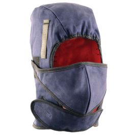 Cotton Twill Liner with Heavyweight Fleece Lining - A cotton twill navy blue shell with a heavyweight red fleece lining keeps winter weather out. Extra long neck length and removable mouthpiece add extra protection. Features warming pack pockets lined with DuPont Thermotex micro porous materials, elastic gap eliminator, and a reflective strip on the back. Twill and binding are flame retardant until washed. Fleece lining, chin strap and fasteners are flame resistant. (Purchase of 6 Each)