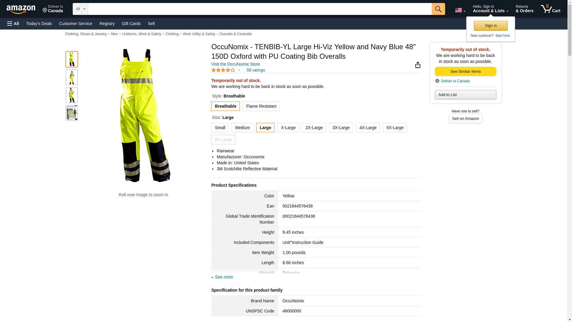 - OccuNomix Large 48" Hi-Viz Yellow, Blue And Silver Premium PU Coated Polyester Breathable Rain Bib Pants With Side Snap Closure, 3M Scotchlite Reflective Stripe And Zip Roll-Away Hood