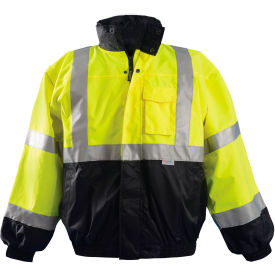 OccuNomix LUX-TJBJ-BYXL X-Large Hi-Viz Yellow And Black Premium Four-Way Black Bottom Bomber Polyurethane Coated Polyester Class 3 Weatherproof Jacket With Zipper And Snap Closure, 3M Scotchlite 2'' Silver Reflective Tape, Black Collar, Cuffs And Waistband, Removable Sleeves And Hood And 4 Pockets (1/EA)