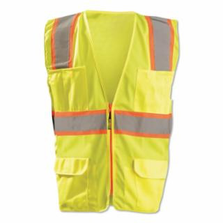 ' High Visibility Vest, ANSI Class 2, Vest Size XL, Color Yellow/Green, Fits Chest Size 44 In. to 46 In., Gender Unisex, Stripe Color Silver, Vest Material Polyester, Vest Closure Type Zipper, ATPV Rating Unrated, Hazard Risk Category (HRC) 0, Vest Stripe Color Family Silver, Back Stripe Pattern U-Block, Vest Length 23 In., Number of Pockets (Inside) 2, Number of Pockets (Outside) 8, Number of Pockets with Closure 0, Features Solid front, mesh back, 10 pockets, Zipper closure '