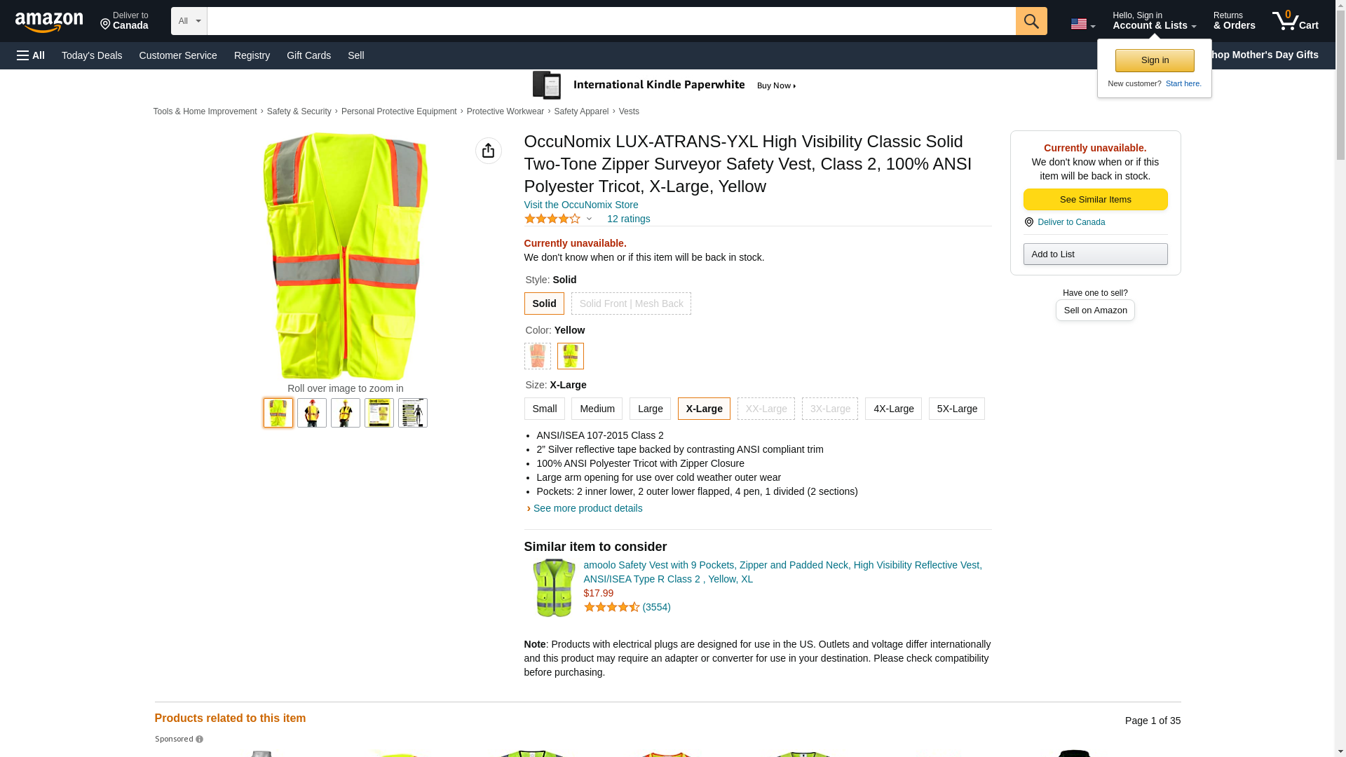 OccuNomix LUX-ATRANS-YXL High Visibility Classic Solid Two-Tone Zipper Surveyor Safety Vest, Class 2, 100% ANSI Polyester Tricot, X-Large, Yellow