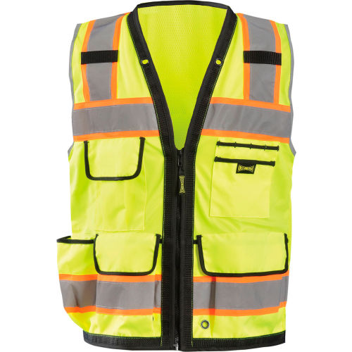 OccuNomix LUX-HDS2T-Y2X Heavy Duty Solid/Mesh Two-Tone Surveyor Vest with Zipper, 8 Pockets, Class 2, 100% ANSI Polyester, 2X-Large, Yellow (High Visibility)