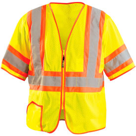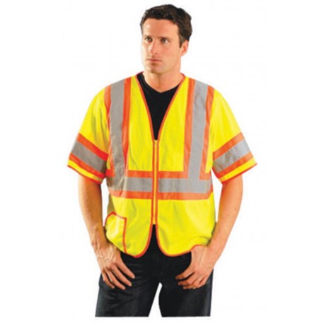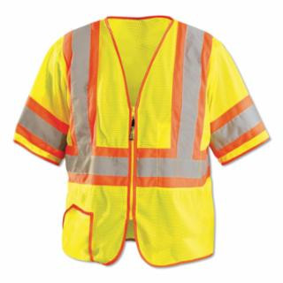 Class 3 classic two-tone mesh vest Manufactured By: OccuNomixSize: 4XLLightweight, 100% ANSI polyester mesh with 2" silver reflective tape stripes, (1) 360° horizontal and (2) vertical, backed by contrasting orange trim.Features short sleeves, zipper front, (1) pocket on lower outside and (1) inside chest with hook and loop closure.Yellow.ANSI 107-2010 Class 3 compliant.