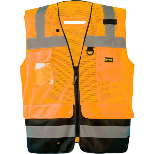 <b>Features:</b><ul style= 'margin-top: 0px; padding-top: 5px; padding-bottom: 5px;'><li>Meets ANSI/ISEA 107-2015 Class 2 - Type R</li><li>Polyester Mesh. 2 Reflective Tape. Fall Protection D-Ring Pass Through. D-Ring at Upper Chest 2 Grommets ? Tethering</li><li>Dirt & Rain Removal Tool Keepers & Lanyards</li><li>Mic Tab</li><li>Zipper Closure</li><li>7 Pockets (includes 4 pen/pencil pockets). 1 Clear ID / Radio Flap Pocket</li><li>1 Split Multi Pen/Tool Pocket. 2 Lower Front Pockets with Hook & Loop Closues</li><li>2 Lower Inside Pockets with Hook & Loop Closures</li><li>1 Lower Inside Flashlight Pocket</li><li>25 Washes</li></ul><br><br>