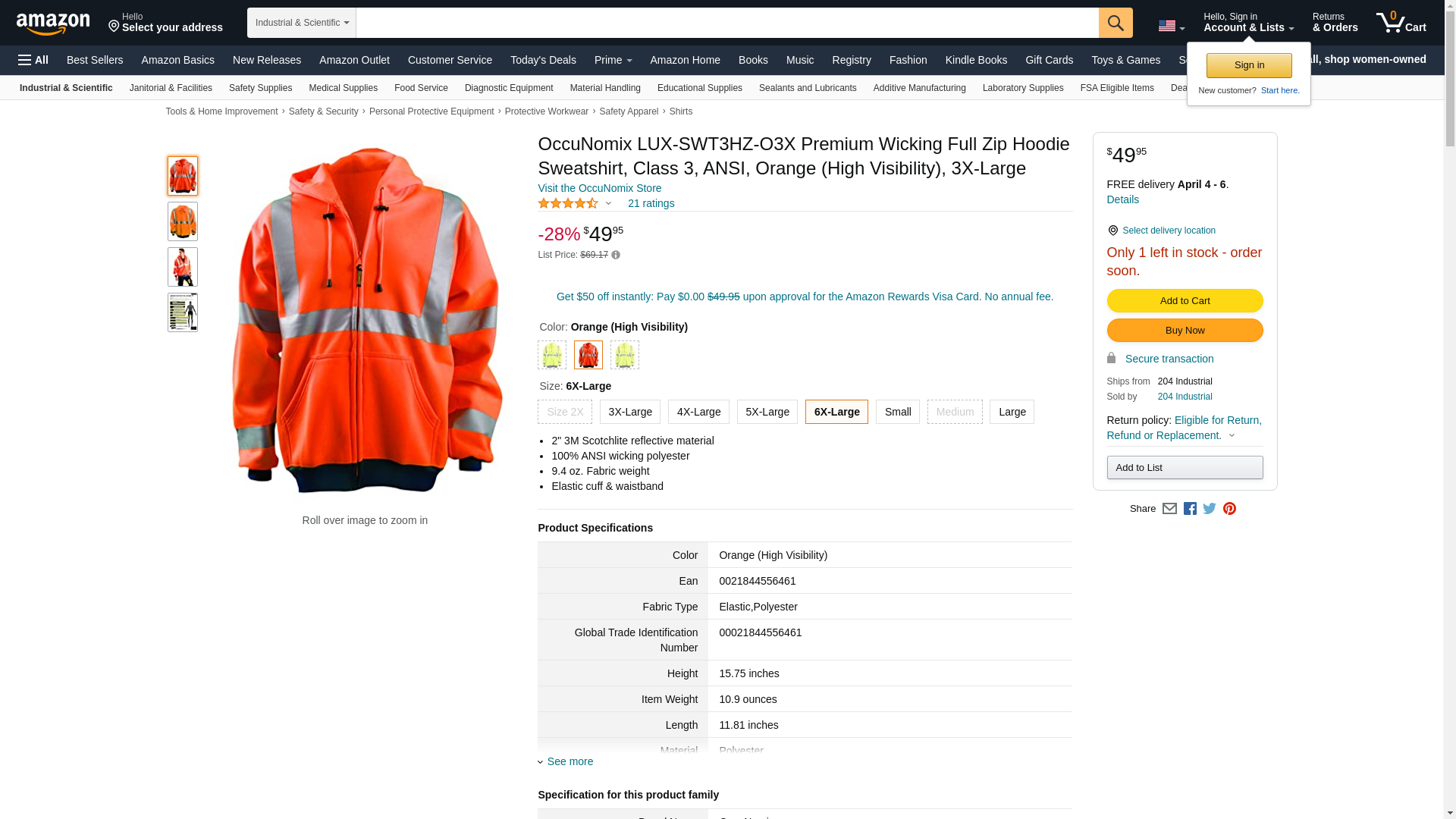 OccuNomix LUX-SWT3HZ-O3X Premium Wicking Full Zip Hoodie Sweatshirt, Class 3, ANSI, Orange (High Visibility), 3X-Large