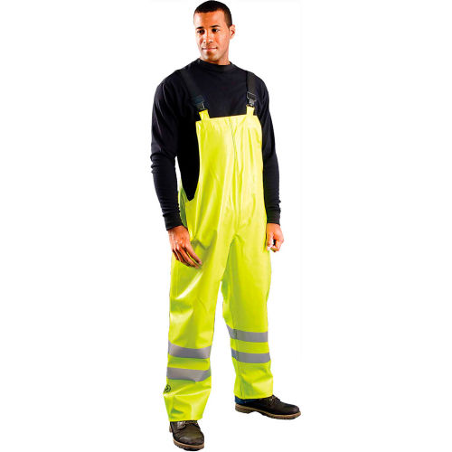 <b>OccuNomix Class E Premium Flame Resistant Rain Bib Pants HRC2, Yellow, XL</b><br><br>Premium Flame Resistant bib pants with 3M™ Scotchlite™ Reflective Material. Pants are constructed using PVC coated Modacrylic/Jersey fabric. The pants have a side snap closure, 1 pass through pocket and are waterproof with high frequency welded seams. The bib pants are ANSI Class E compliant and meet ASTM F1891 and F2733. In addition, the pants are arc rated; ATPV = 18.5 cal/cm <sup>2</sup>, NFPA 70E/HRC=2. Flame resistant up to 25 washes.<br><br>