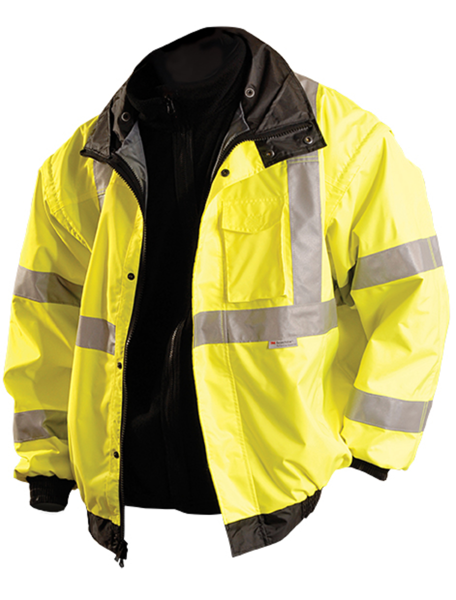 OccuNomix 3X Hi-Viz Yellow OccuLux Premium Four-Way Original Bomber Polyurethane Coated Polyester Class 3 Weatherproof Jacket With Zipper And Snap Closure, 3M Scotchlite 2" Reflective Tape, Black Collar, Cuffs And Waistband, Removable Sleeves And Hood And 4 Pockets