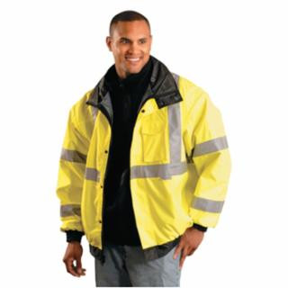 - OccuNomix Large Hi-Viz Yellow OccuLux Premium Four-Way Original Bomber Polyurethane Coated Polyester Class 3 Weatherproof Jacket With Zipper And Snap Closure, 3M Scotchlite 2" Reflective Tape, Black Collar, Cuffs And Waistband, Removable Sleeves And Hood And 4 Pockets