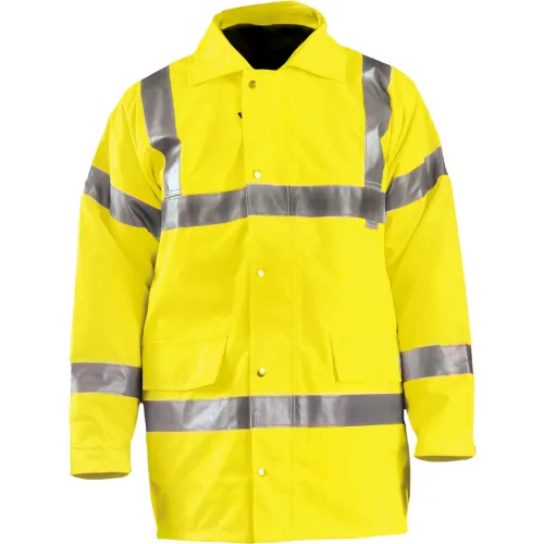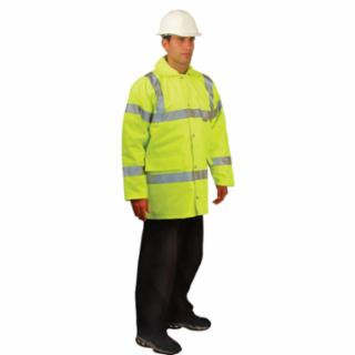 - Premium Quality Class 3 Five-Way (5-in-1) Parka Jacket, with 2" 3M Scotchlite Silver Reflective Tape, Zipper and Snap Closure, Removable and Reversible Quilted Vest with Sleeves, and Convenient Roll-Away Hood