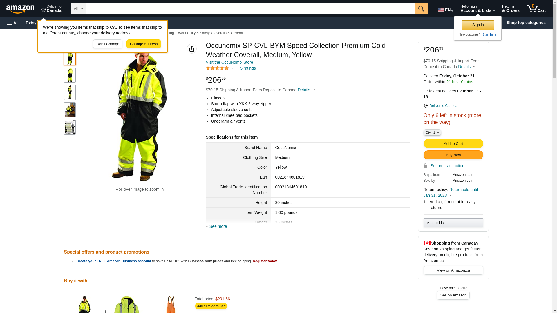 Occunomix SP-CVL-BYM Speed Collection Premium Cold Weather Coverall, Medium, Yellow