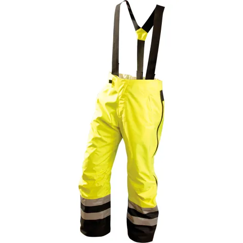 | Feature | <b>Price For:</b> Each <b>Includes</b>: Reflective Striping <b>Thickness</b>: 0.45mm <b>Gender</b>: Men\'s <b>Material</b>: Polyester <b>Standards</b>: ANSI/ISEA 107 - 2010 Class E <b>Liner Material</b>: Polyester <b>Color</b>: yellow <b>Number of Pockets</b>: 3 <b>Closure Type</b>: zipper <b>Item</b>: Hi-Visibility Breathable Rain Pants <b>ANSI Class</b>: 07-2010 Class E <b>Seam Style</b>: Sealed <b>Resists</b>: water <b>Fits Waist Size</b>: 43-1/4" |