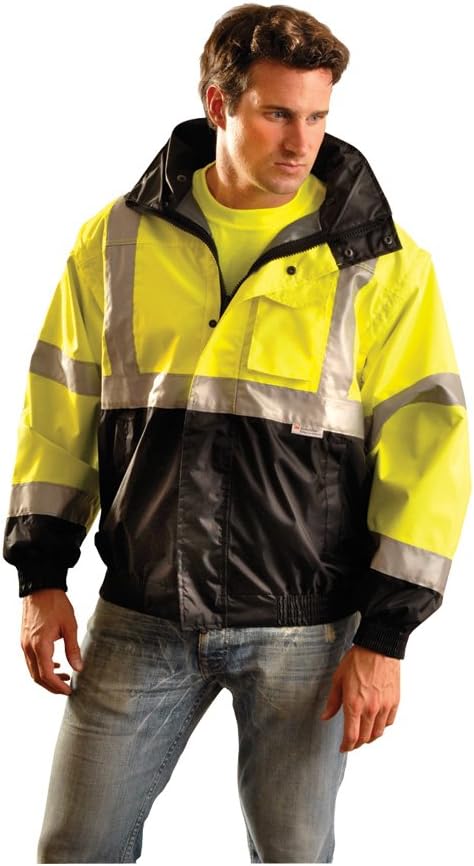 Pockets 2" Reflective Tape Zipper And Snap Closure Class 3 Premium Fleece Line Collar Cuffs And Waistband Removable Hood And Outer Sleeves Jacket Bomber Four-Way Large Polyester Yellow/Black Pu Coating Black
