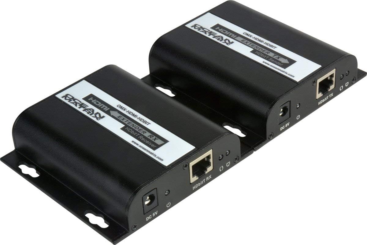 The Ocean Matrix OMX-HDMI-HDBIT extends high definition audio/video transmission beyond the standard distances for HDMI cable limitations via HDbitT technology. Consisting of a transmitter and a receiver, this system delivers full 1080P HDMI signal up to 394 feet over a single Cat5/5E/Cat6 network cable with or without network switches, and network routers. Unlimited Extend and Split Capability The system incorporates HDbitT (High Definition Digital bit Transmission Technology) protocol for better image clarity and high performance over long distances without a converter. This technology allows signal distribution through switches and routers to multiple receivers and displays without loss in image quality. Works perfectly when sending HDMI over an IP network, allowing simple function of 1 to 1 or 1 to multiple cascade setups. Plug and Play The OMX-HDMI-HDBIT extender is compatible with new and existing systems without rewiring and automatically adapts to various cable lengths up to 394 feet. IR signal transmission allows for remote control of the source at a secondary location using IR extension cables (included). Ideal for remote HD monitoring, projections screens, home theatre, outdoor advertising, remote conferencing, CCTV and high-end security.