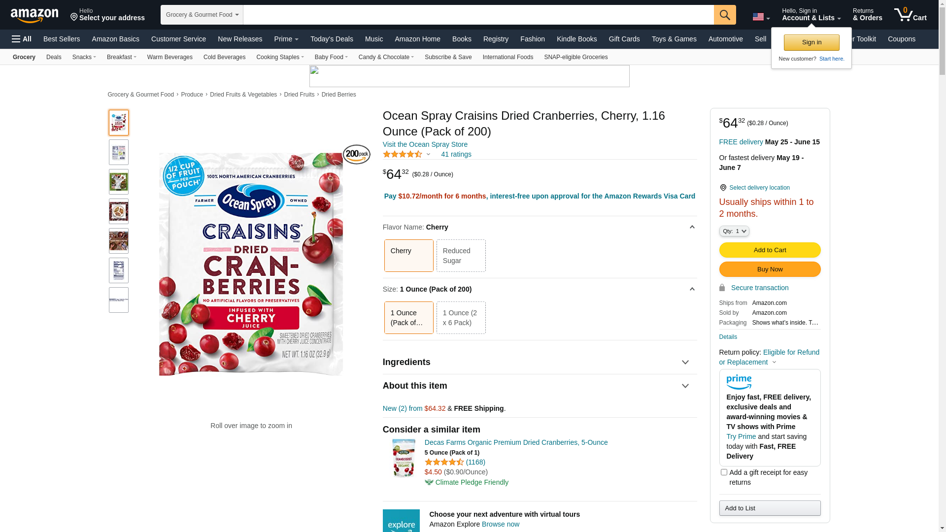 Ocean Spray Craisins Dried Cranberries, Cherry, 1.16 Ounce (Pack of 200)