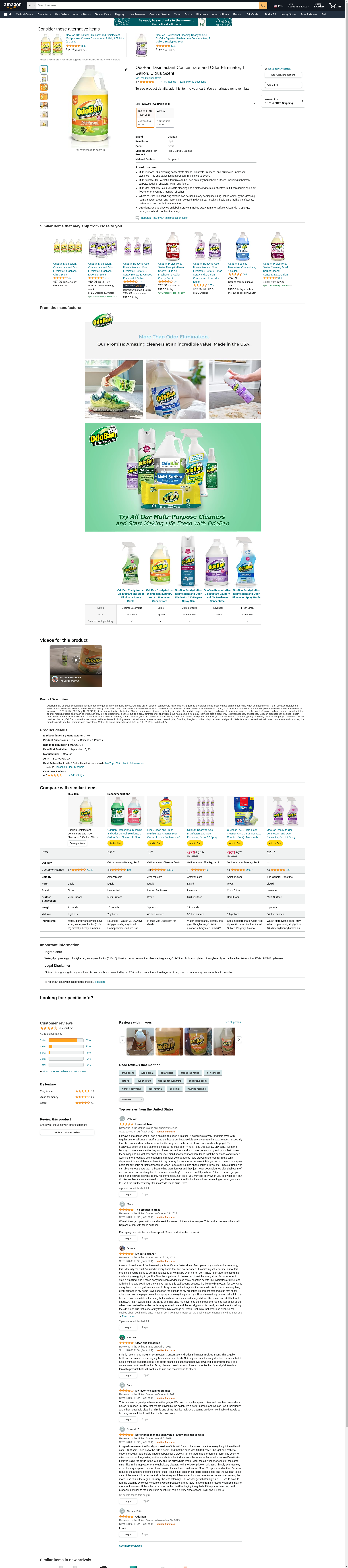 OdoBan Disinfectant Concentrate and Odor Eliminator, 4 Gallons, Citrus Scent