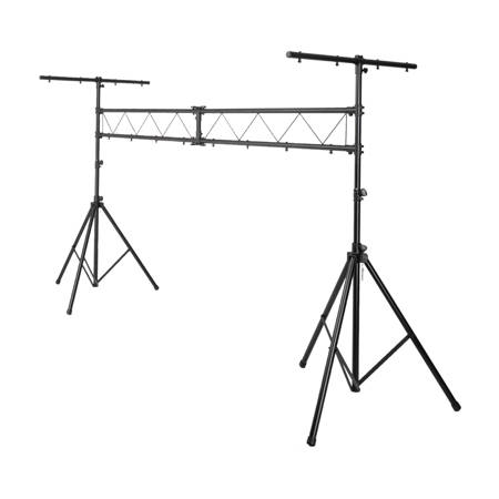 - (2) black aluminum/steel tripods that extend up to 9 feet(2) 5 foot truss I-beams when connected span 10 feet wide(2) T-Bars great for bands and mobile DJs