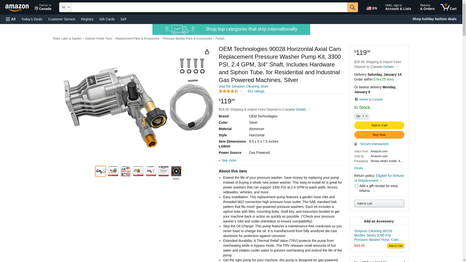 OEM Technologies 90028 Horizontal Axial Cam Replacement Pressure Washer Pump Kit, 3300 PSI, 2.4 GPM, 3/4" Shaft, Includes Hardware and Siphon Tube, for Residential and Industrial Gas Powered Machines, Silver