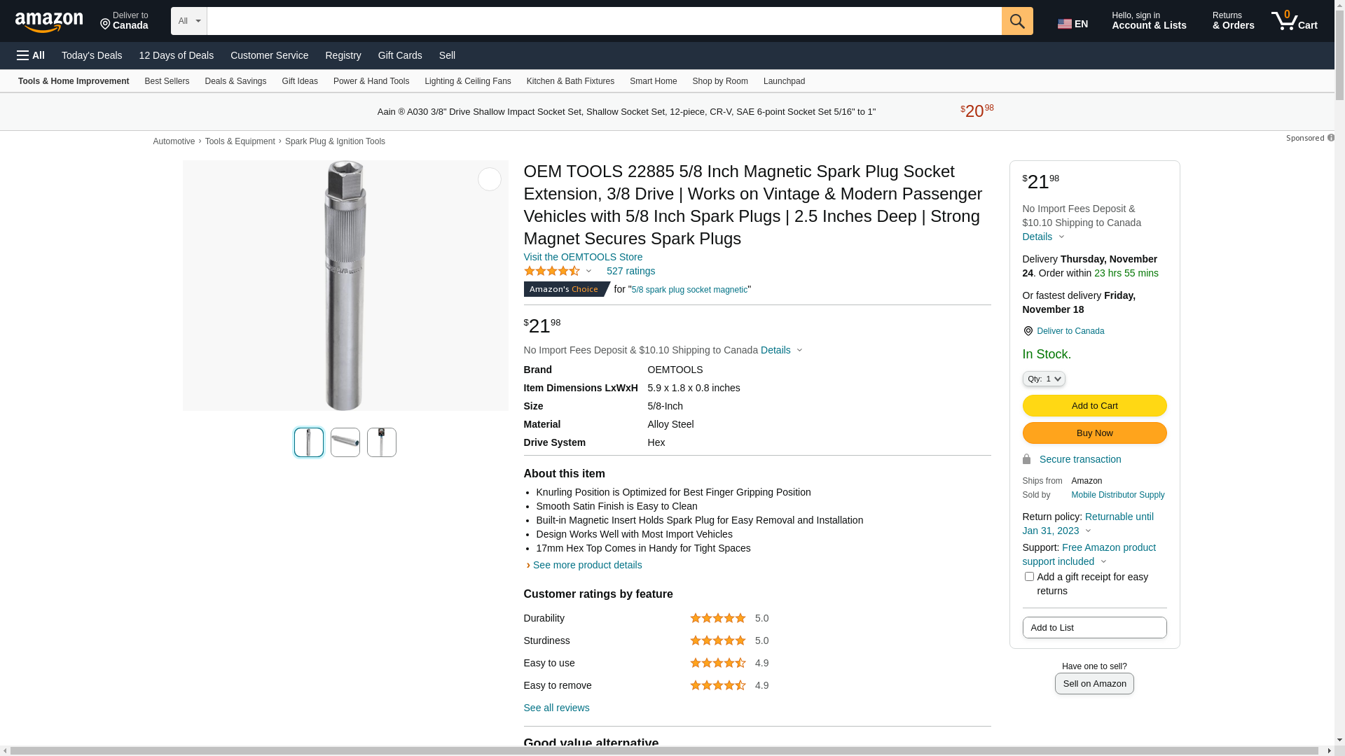 OEMTOOLS 22885 5/8 Inch Magnetic Spark Plug Socket Extension, 3/8 Drive, 17mm Hex, Works on Most Import Vehicles with 5/8 Inch Spark Plugs, Socket Set With Strong Magnet For Secure Grip