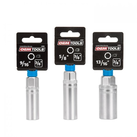 OEMTOOLS 22891 3/8 Drive Magnetic Spark Plug Socket Set, Contains 5/8" (16 mm), 9/16", and 13/16" 6 Point Deep Sockets, Fits Most Car Spark Plugs