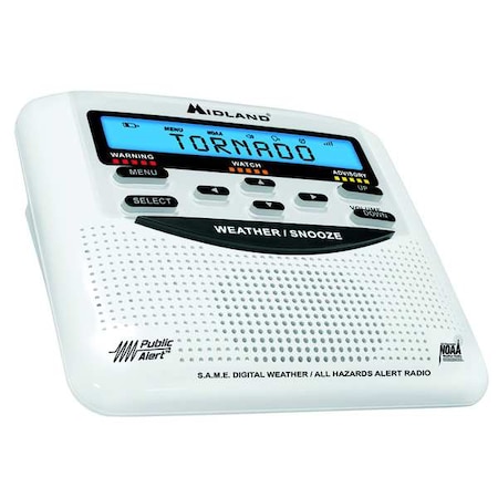 The Midland WR-120B 25 Code S.A.M.E. Weather Alert Radio enables you to listen to music while out in the yard, a camping trip, on the boat, and anywhere else you decide to take it. With the Midland WR120B Alert Weather Radio you can stay connected during severe weather conditions, emergencies, or power outages. The event of special weather warning broadcasts, the WR-120B radio is automatically activated along with a loud tone, an LED indicator and an alert message on the LCD. The WR-120B weather radio also features the S.A.M.E. Digital Weather/Hazard Alert feature, providing you with constant monitoring of your local NWS broadcast. The S.A.M.E. decoding receiver allows you to hear only messages for the area(s) concerning you. This radio features an alarm clock, 7 preset weather channels, and can be used with battery or AC power. Plus the large LCD display makes it easy to read with its adjustable illumination.