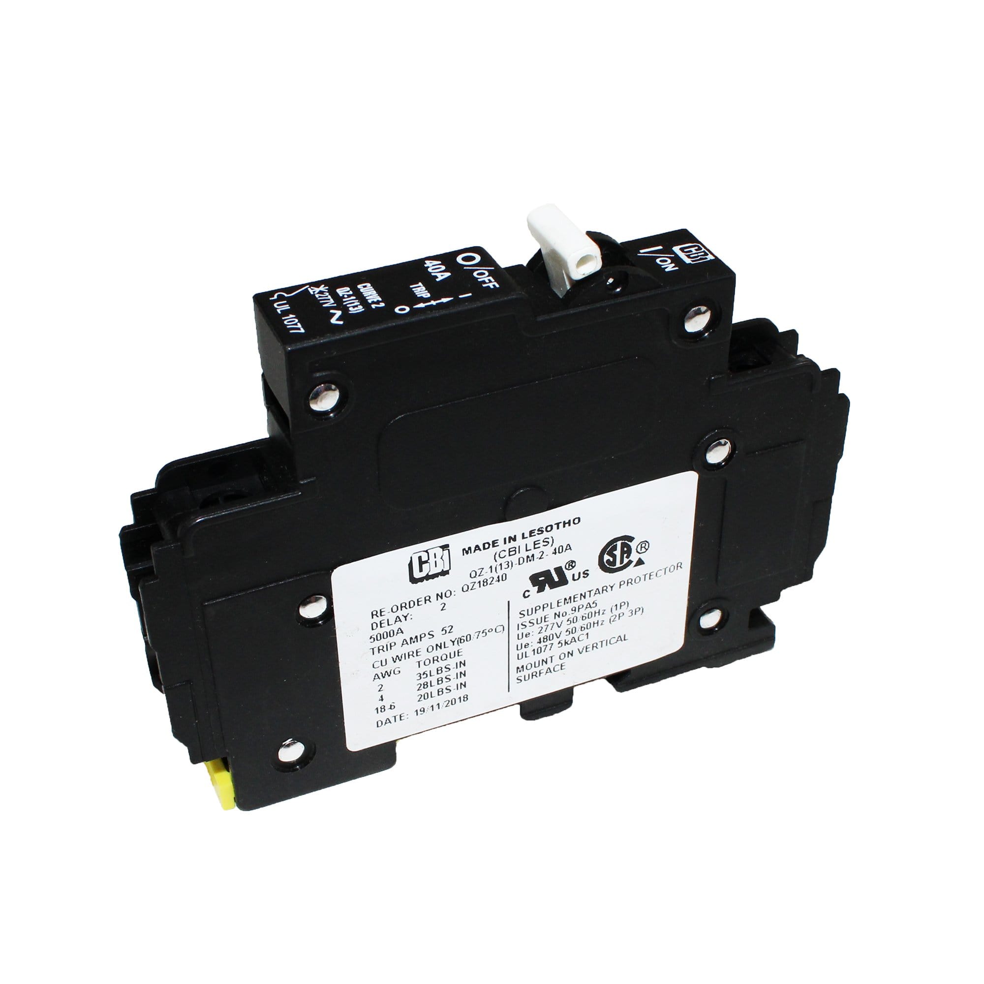 <p>MidNite Solar MNEAC40 Circuit Breaker 40A 120V.</b> <p> MidNite's breakers are rated to break the full rated load at the rated voltage repeatedly, with NO DAMAGE. Always use a properly sized breaker for disconnecting. All MidNite circuit breakers can be used at 100% rated current when mounted in a MidNite enclosure. 30, 40, 50, 60 amp 120VAC Supplementary protection 1077 din rail mount. <p> Note: 489A is the branch circuit rating, 1077 is for supplementary protection. <p> <b>Features</b> <p> <ul> <li>Environmental Rating - Type 1 (Indoor)</li> <li>Listed for US & Canada</li> <li>Breaker Torque Value: 20 In-Lbs (2.3NM)</li> <li>3,000 AIC</li> </ul
