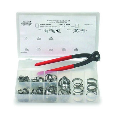 This Oetiker 18500060 StepLess one-ear clamp kit contains stainless steel StepLess one-ear clamps and a pair of standard jaw pincers for clamping hose clamps in a variety of diameters. The dimple or indentation on the ear of the clamp increases the clamping force for a more secure hold, and the mechanical interlock of this clamp keeps it securely closed and provides better corrosion resistance than a spot-weld, which is vulnerable to corrosion. The ear clamps are stainless steel for resisting scaling and corrosion for at least 1000 hours of exposure to salt spray in compliance with Deutsches Institut für Normung-English International Organization for Standardization (DIN EN ISO) standard 9227. This clamp kit is suitable for attaching a variety of hoses to fittings or other devices in various industrial applications, such as heavy machinery, hydraulics, irrigation, food processing, automobile manufacturing, and petroleum industries, among others. Hose clamps attach tubing and hoses to fittings to prevent flow leakage, or are used for hose or wire mounting applications. They come in a variety of designs to distribute uniform pressure over the circumference of hoses to bind them to fittings. Other hose clamp types are used for mounting, strapping, clamping, and positioning hose or wire. Hose clamps are suitable for a large number of industries, and commonly used in industrial, electronic, and automotive applications. Oetiker manufactures hose clamps, rings, couplings, conveyor chains, hinged belts, and other connecting parts and accessories. The company, founded in 1942 and headquartered in Horgen, Switzerland, meets International Organization for Standardization/Technical Specification (ISO/TS) standard 16949. What's in the Box? 10 1/2"/13.3mm StepLess 1-ear clamps 10 9/16"/14.5mm StepLess 1-ear clamps 10 5/8"/15.7mm StepLess 1-ear clamps 10 23/32"/18.5mm StepLess 1-ear clamps 10 7/8"/22.6mm StepLess 1-ear clamps 10 1"/25.6mm StepLess 1-ear clamps 10 1-1/8"/28.6mm Ste