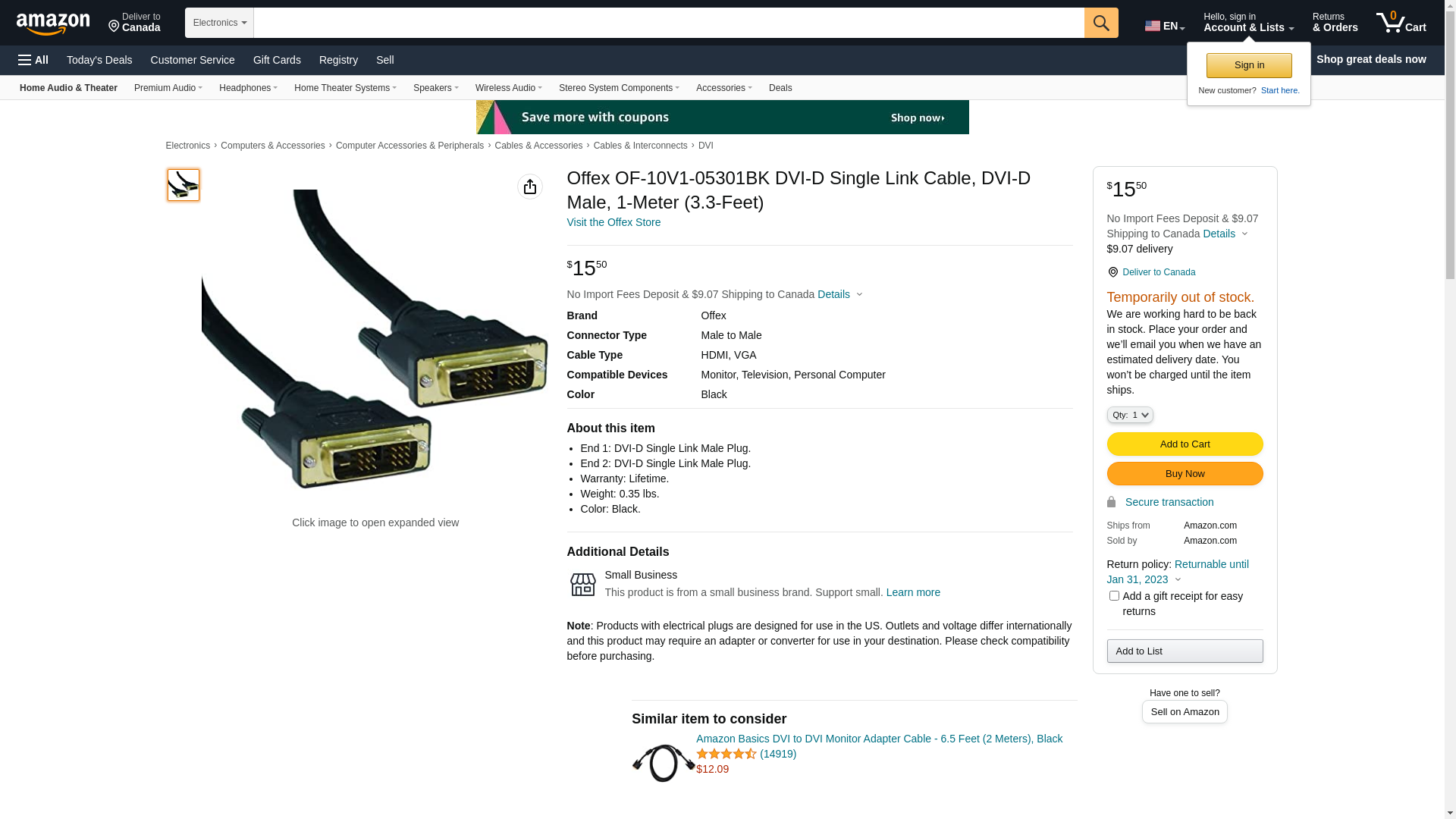 Offex OF-10V1-05301BK DVI-D Single Link Cable, DVI-D Male, 1-Meter (3.3-Feet). End 1: DVI-D Single Link Male Plug.. E...