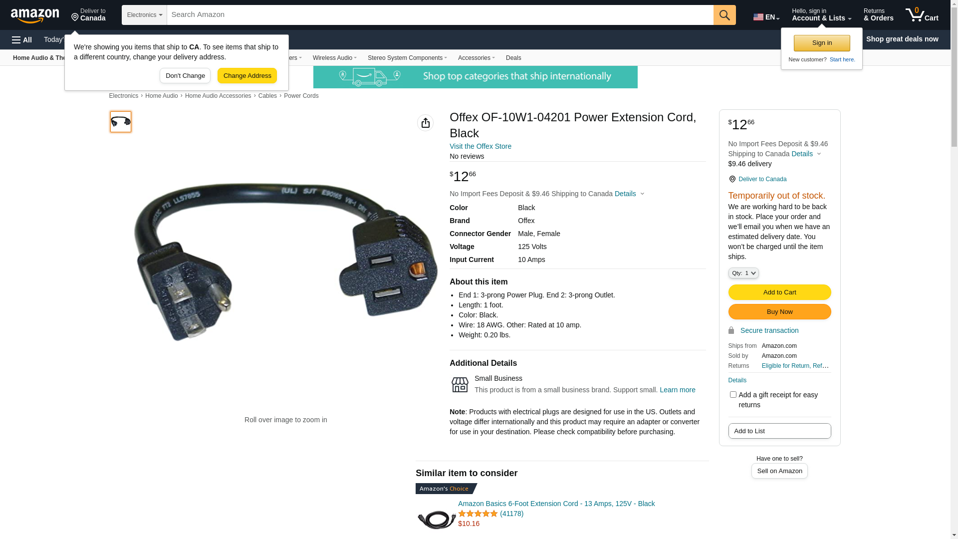 Offex Power Extension Cord, Black, NEMA 5-15P to NEMA 5-15R, 10 Amp, UL / CSA rated, 1 foot