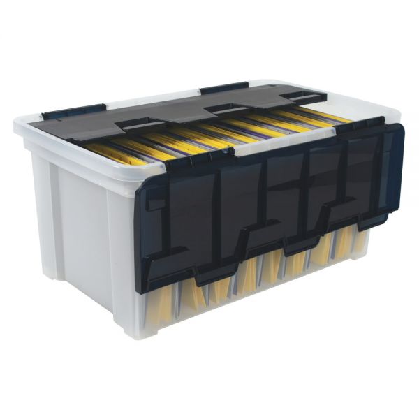 Office Depot Brand Flip Lid Tote, 11 1/10inH x 14 1/5inW x 23 3/5inD, Clear/Navy.Tote,Flip Top W/Rails,Clr/BluInterlocking cover design prevents lost lids The deep capacity box with clever wing lid features convenient file rails and a sturdy hinge design. Reinforced wing lid stays attached to the base. Protects contents from dirt and moisture, and accommodates hanging file folders. Stackable with built-in handles for easy carrying.
