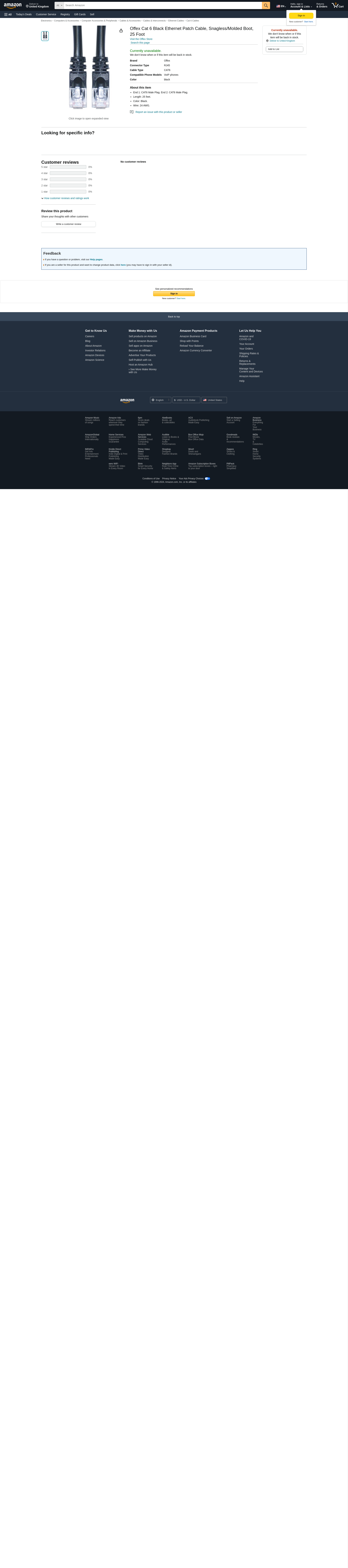 Offex Cat6 Ethernet Patch Cable, Snagless/Molded Boot, 25-Foot, Black (OF-10X8-02225). End 1: CAT6 Male Plug. End 2: ...