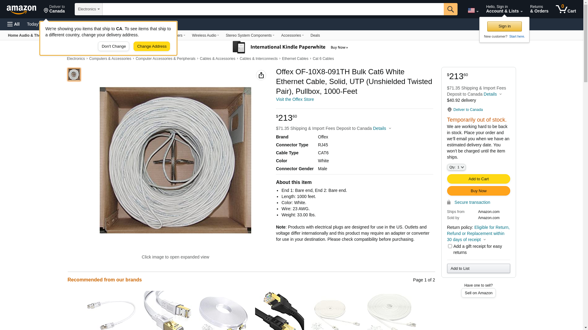 Offex OF-10X8-091TH Bulk Cat6 White Ethernet Cable, Solid, UTP (Unshielded Twisted Pair), Pullbox, 1000-Feet. End 1: ...
