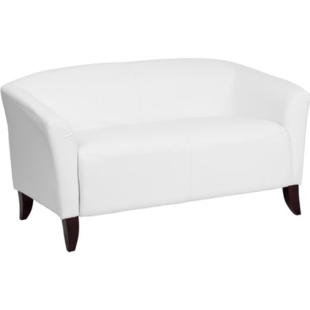 <br /> <br /> <b>Features : </b> <br /> <li> Contemporary Design, Office or Home Office Seating, Sloping Arms, Slightly Curved Seat and Back</li> <li> Fixed Seat Cushion, 1.8 High Density Foam, Sturdy Hardwood Construction</li> <li> Cherry Stained Wood Feet. White LeatherSoft Upholstery, LeatherSoft is leather and polyurethane for added Softness and Durability</li> <li> Seat Size: 42"W x 20"D, Back Size: 40"W x 13"H, Seat Height: 19"H</li> <li> Product Dimensions: 29"D x 29"H x 52"W.</li>