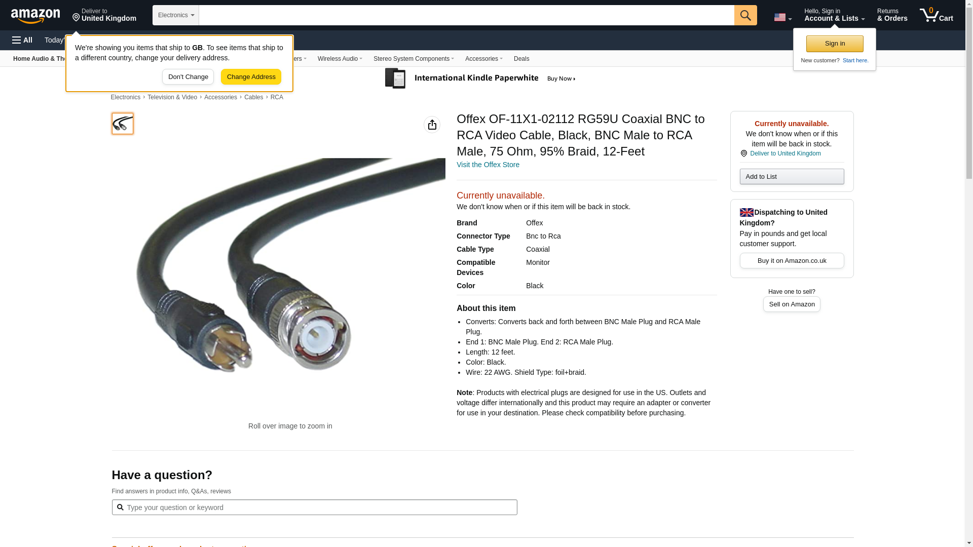 - End 1: BNC Male Plug. End 2: RCA Male Plug.