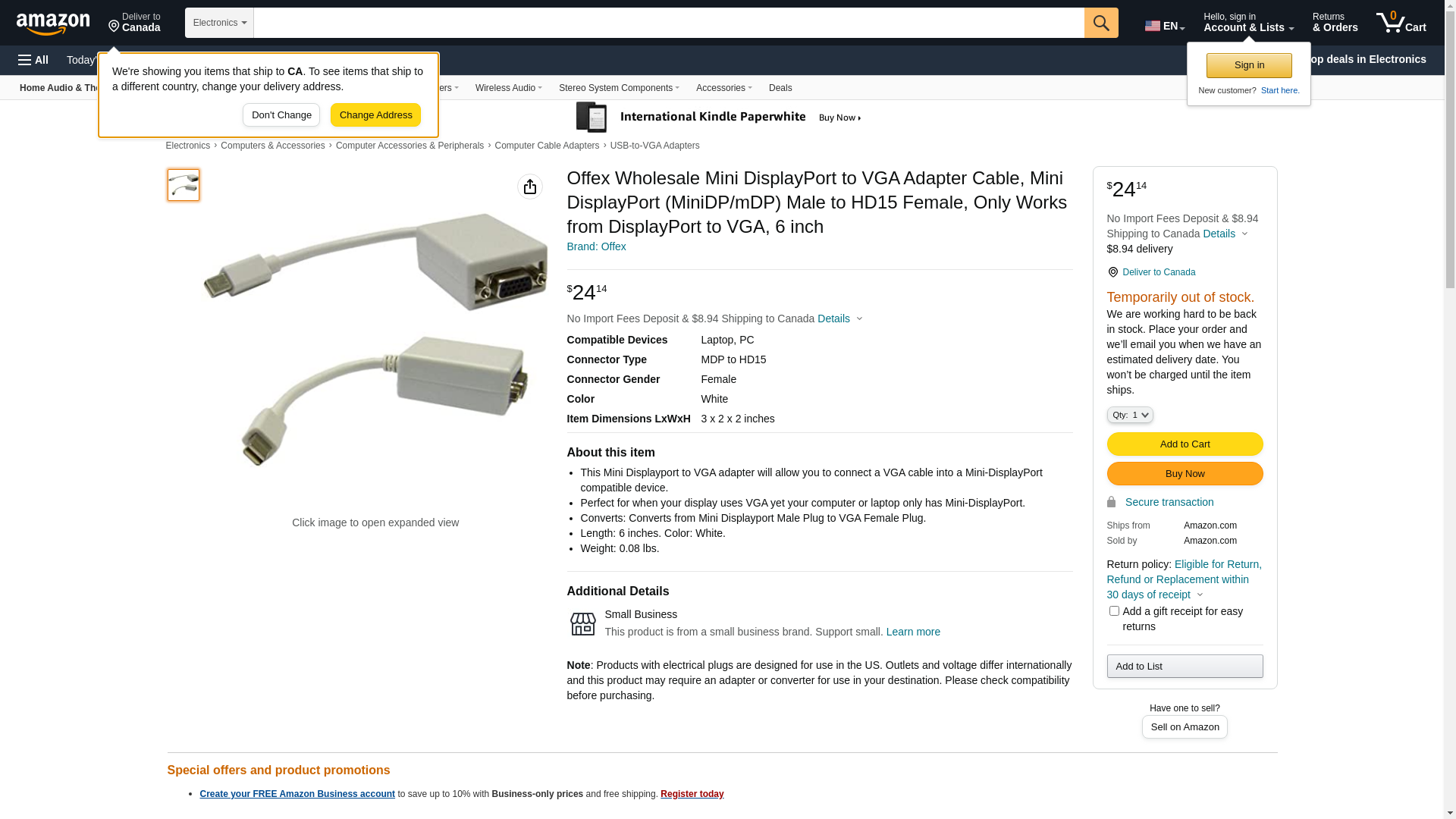 Offex OF-30H1-65000 6-Inch Mini Display Port to VGA Adapter Cable. Converts: Converts from Mini Display port Male Plu...