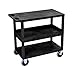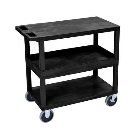<br /> <br /> <b>Features : </b> <br /> <li> Includes one 2.5" deep tub shelf and two 1.625" high flat shelves with 0.25" retaining lip to secure items from sliding off.</li> <li> Measures 35.25"W x 18"D x 35.5"H with a clearance between shelves of 10.5" and 12.5" for easy access. Made in the USA.</li> <li> Multipurpose utility cart ideal for use as serving or storage cart, garden wagon, and more. Assembly required.</li> <li> Rolling cart with four 5" casters, two with locking brake (full swivel), two fixed non-locking casters. Color: Black.</li> <li> Ergonomic push handle molded into top shelf. Maximum weight capacity of 500 lbs (evenly distributed).</li>