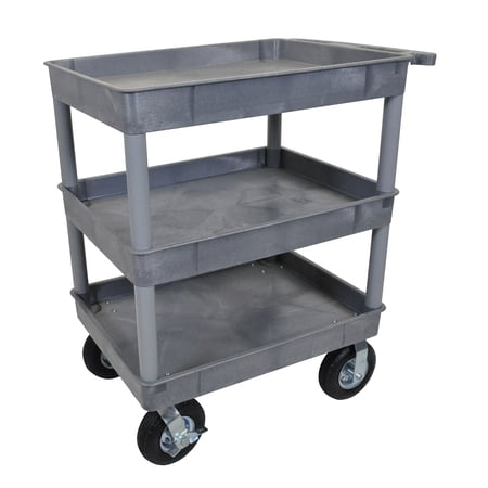 <br /> <br /> <b>Features : </b> <br /> <li> Shelves and legs are constructed with an injection molded thermoplastic resin.</li> <li> It comes with 3 Tub shelves that are 2 3/4" Deep.</li> <li> Ergonomic push handle molded into the top shelf. Four 8" zinc-plated casters, two stationary and two swiveling with locking brakes.</li> <li> 400 pounds maximum weight capacity ( evenly distributed ).</li> <li> Overall assembled dimensions are 24"D x 32"W x 43.25"H.</li>