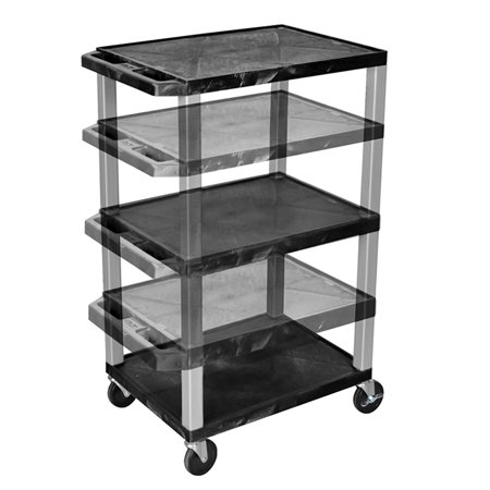 <br /> <br /> <b>Features : </b> <br /> <li> Measures 24"W x 18"D with multiple legs included to achieve height options of 16"-42"H. Nickel-colored legs measure 1.5" square.</li> <li> 0.25" retaining lip borders flat shelves.</li> <li> Rolling cart with four 4" silent roll, full swivel heavy duty casters, two with locking brake.</li> <li> Weight: 30 lbs.</li> <li> Assembly required. Made in the USA.</li>