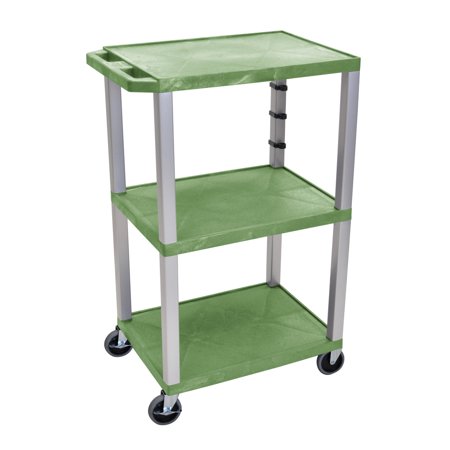 <br /> <br /> <b>Features : </b> <br /> <li> Made of recycled molded plastic shelves that will not scratch, dent, rust or stain.</li> <li> 0.25" retaining lip borders flat shelves. Nickel-colored legs measure 1.5" square.</li> <li> Ergonomic push handle molded into top shelf for easy maneuverability.</li> <li> Assembly required. Measures 24"W x 18"D x 42.5"H. Color: Green.</li> <li> Lifetime Warranty.</li>