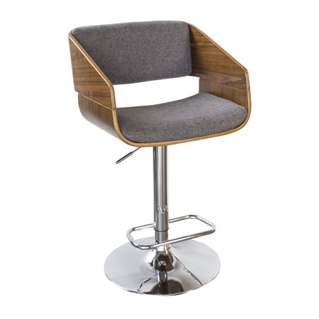 <ul> <li>Adjustable height seat 24 to 32", seat back 11.5" H, max back height 43.5", weight capacity: 350 lbs. sold individually.</li> <li>Item Dimensions: 43.5"L x 18.5"W x 17"H, Item Weight: 25 lbs. Material: Wood, Fabric, Foam, Chrome.</li> <li>Padded seat measures 18.5" W x 14.5" D, grey poly fabric with foam cushion, 360 degree swivel.</li> <li>Chrome pedestal base, 17" dia., attached footrest. Clean lines and a modern silhouette.</li> <li>Color: Gray. Country of origin: China. Warranty: 90 Day Limited. Assembly Required: Yes..</li> </ul>