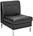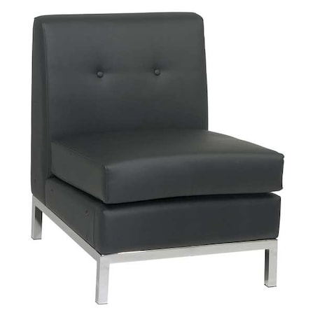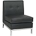 This faux leather armless guest chair is a modular piece of furniture that can be combined with other members of the Wall Street collection to create a complete reception area seating arrangement.Wall Street gives you the options to fashion the size and style best suited for your office. Armless chair features easycare faux leather upholstery, Dacron wrapped foam cushions, chrome steel base and legs, and a kiln dried hardwood frame.Ships ready to assemble.