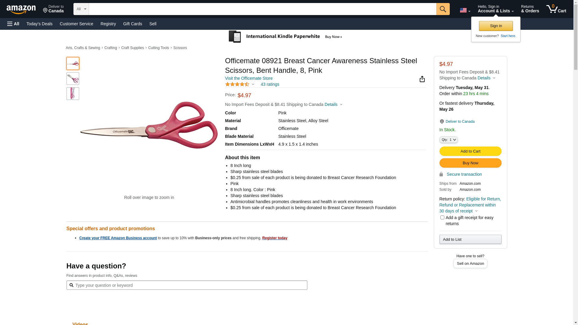 Officemate Breast Cancer Awareness 8 Inch Stainless Steel Scissors, Antimicrobial Bent Handle, Pink (08921). 8 Inch l...