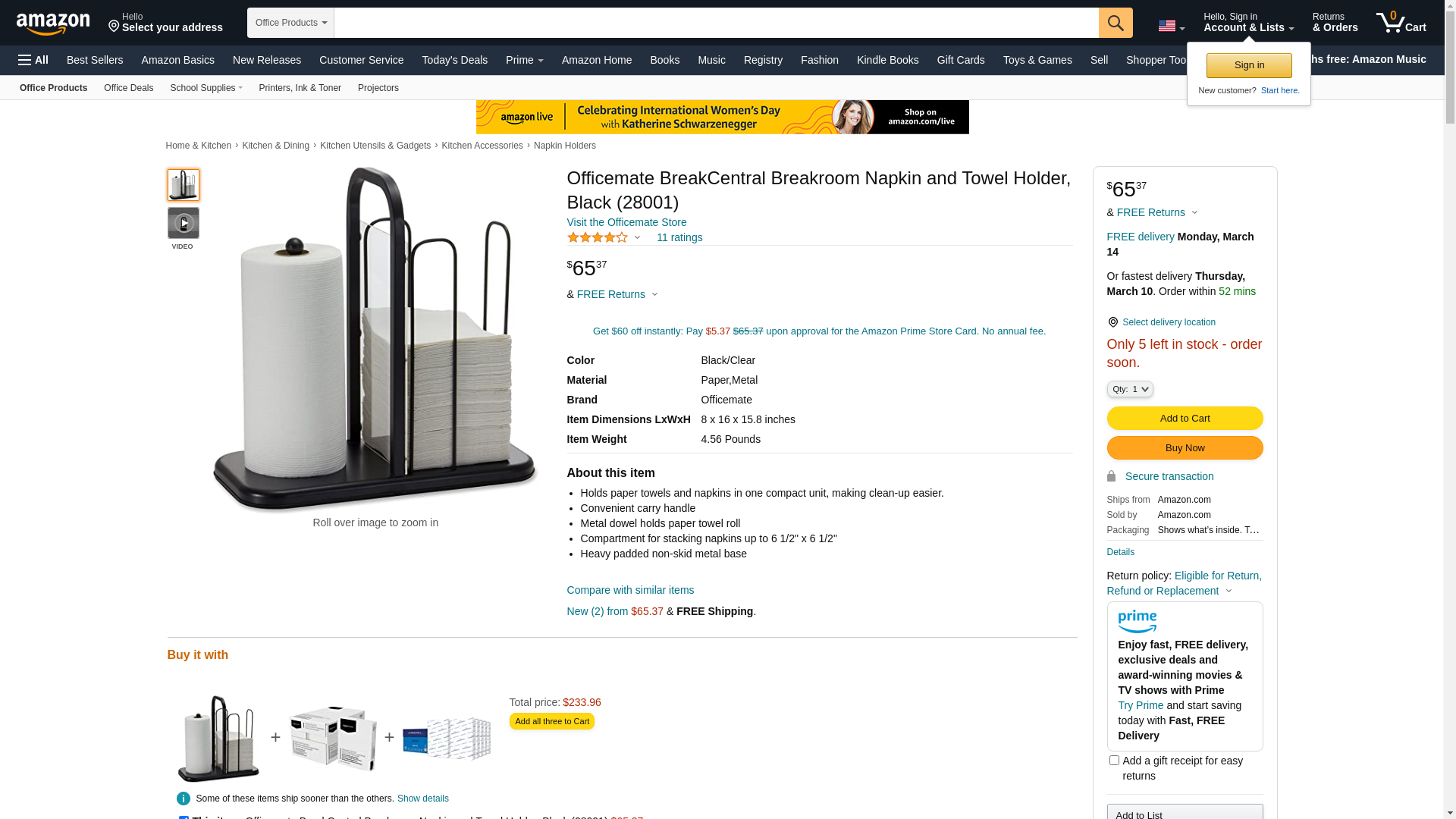Officemate BreakCentral Breakroom Napkin and Towel Holder, Black (28001)