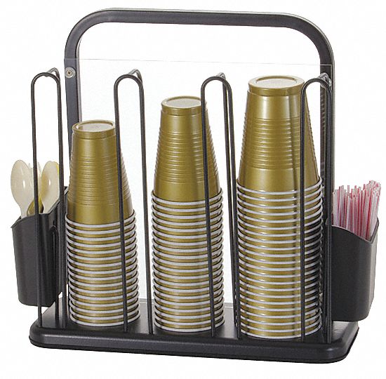 <p>Cup and cutlery holder stores three different size cups or lids up to 16 oz. and utensils in one compact unit. Weighted, metal nonskid base will not scratch the countertop and ensures the holder will not slide. Convenient carry handle offers an easy way to bring this holder to gatherings. Three separate cup compartments let you store more cups with a variety of sizes. Two detachable side pockets hold utensils and are designed for easy cleaning.</p>