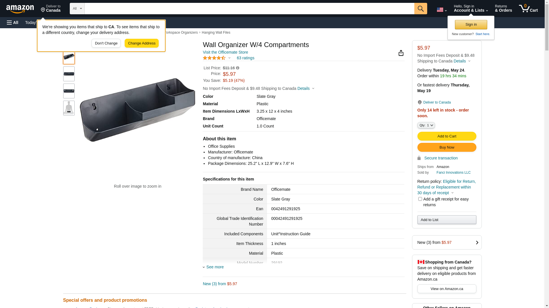 | Feature | Price For: Each Material: Plastic Color: Gray Item: Wall Organizer w/3 Compartments Height: 4" Depth: 3-1/4" Width: 12" Country of Origin (subject to change): China |