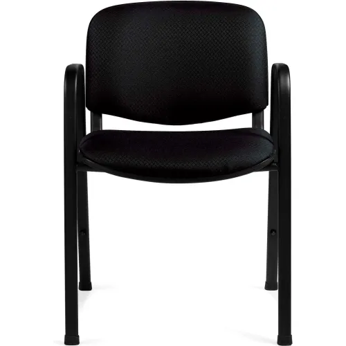 - Patterned black fabric chair for softness and a professional look. Fixed-arm design delivers a firm brace.