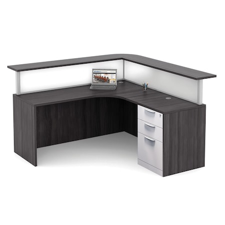 OfficeSource Desk & Credenza Set for Office or Home, Coastal Gray Laminate, Corner Transaction Top, 3 Drawer Full Pedestal, Acrylic Modesty Screen