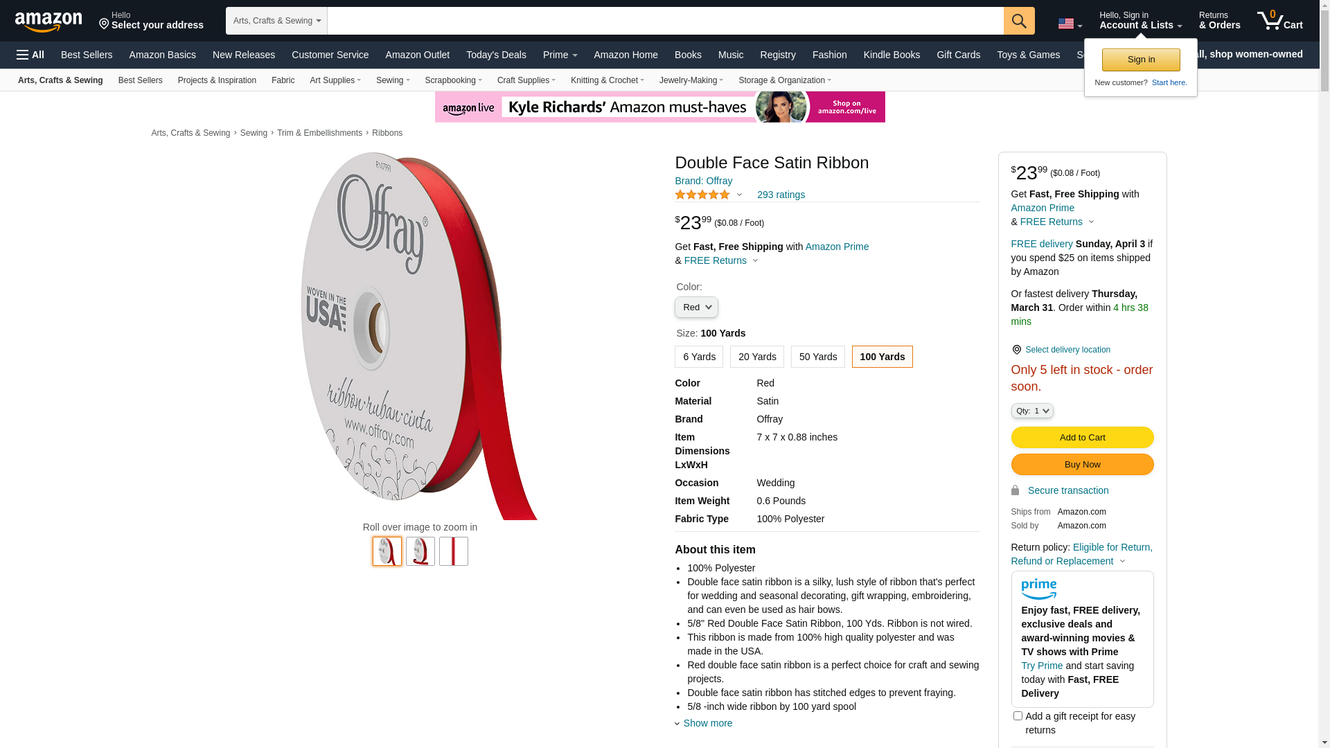 - 5/8'' Red Double Face Satin Ribbon, 100 Yds. Ribbon is not wired.