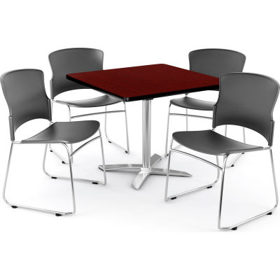 OFM Core Collection Breakroom Set, 42" Square Multi-Purpose Folding Table in Mahogany, 4 Multi-use Plastic Stack Chairs in Gray (PKG-BRK-026-0009)